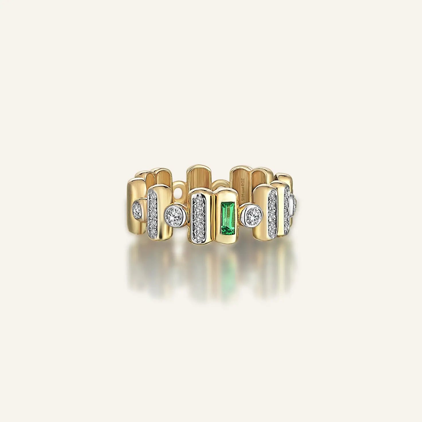 Capturing the moment when light breaks and disperses, Beams Baguette Tsavorite Ring transforms the energy of illumination into a sculptural rhythm. Crafted from 14k gold, it combines the vivid green of baguette-cut tsavorite with the brilliance of diamonds, echoing the balance and renewal found in nature. Each capsule form symbolizes a fragment of light — together forming a harmonious flow that reflects the essence of the Fragments Collection. With its timeless silhouette and refined allure, this ring effortlessly complements every style, from everyday elegance to statement looks.