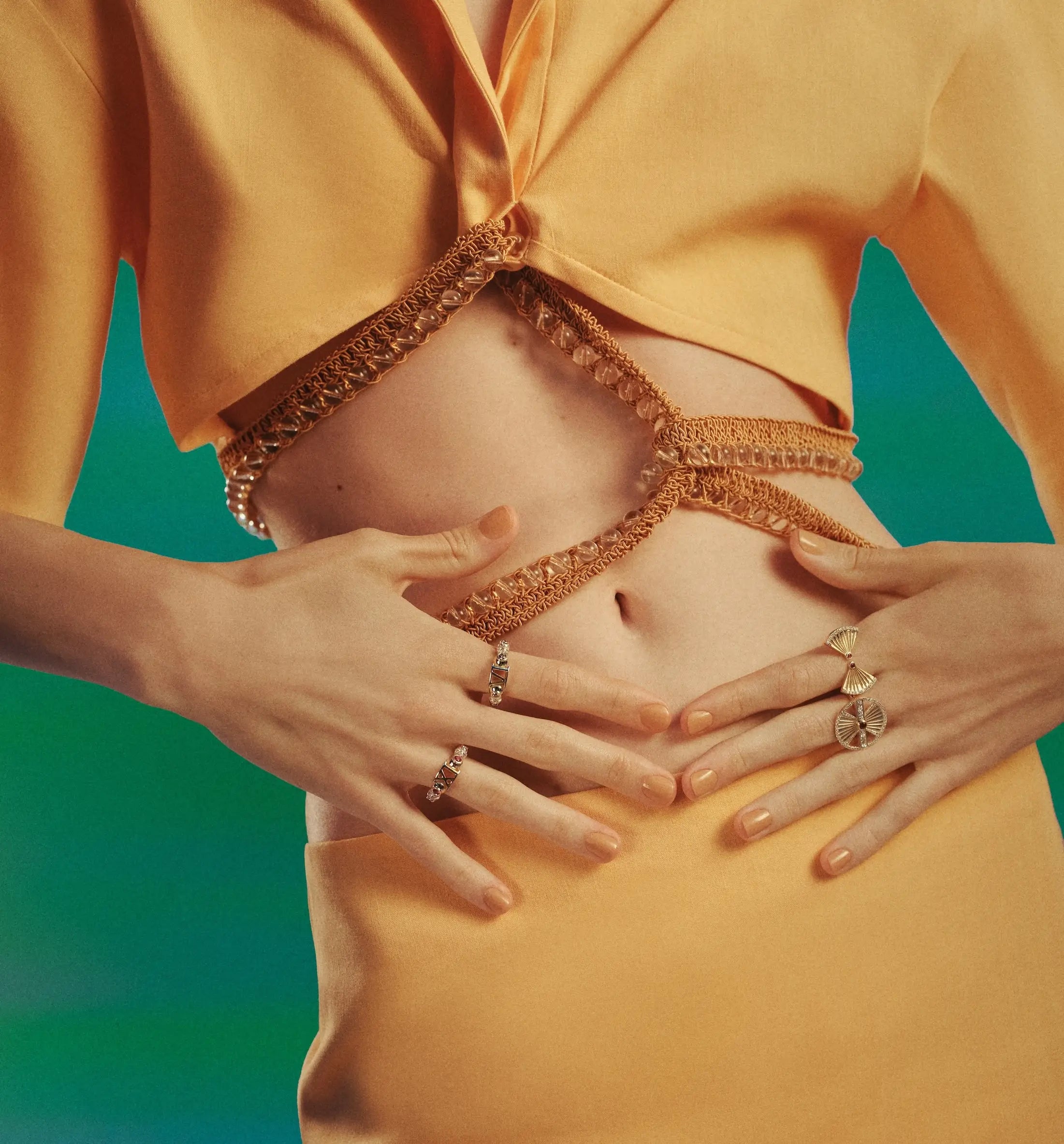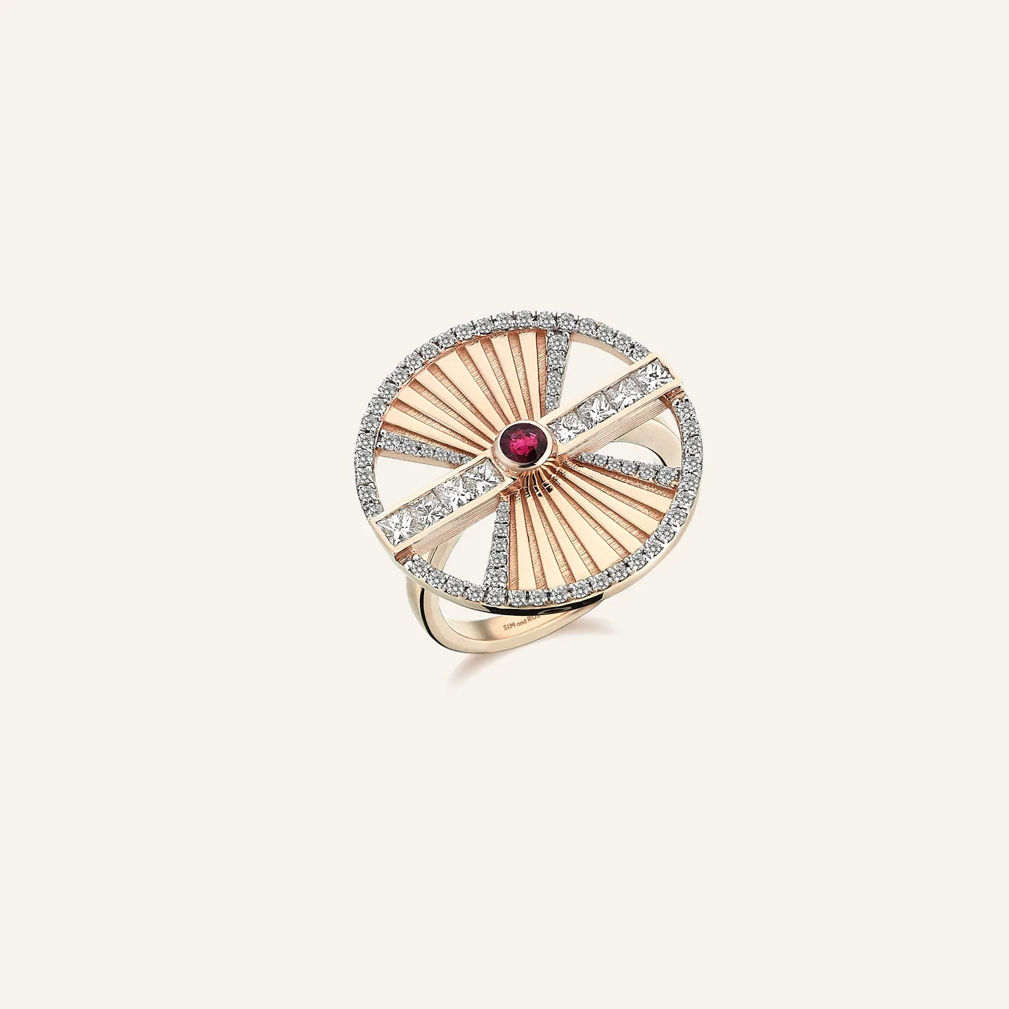 Inspired by the sun's energy and the captivating reflections of its light, Flare Ruby & Diamond Cocktail Ring exudes a powerful and sophisticated presence. Designed with the warm tones of 14K gold, the ring is brought to life by the deep red of the round-cut ruby at its center. The diamonds surrounding the ring and the sun-kissed gold details create a dazzling sparkle with every glance. Its modern and symmetrical form makes it both a striking statement on its own and a complementary piece to special outfits.
