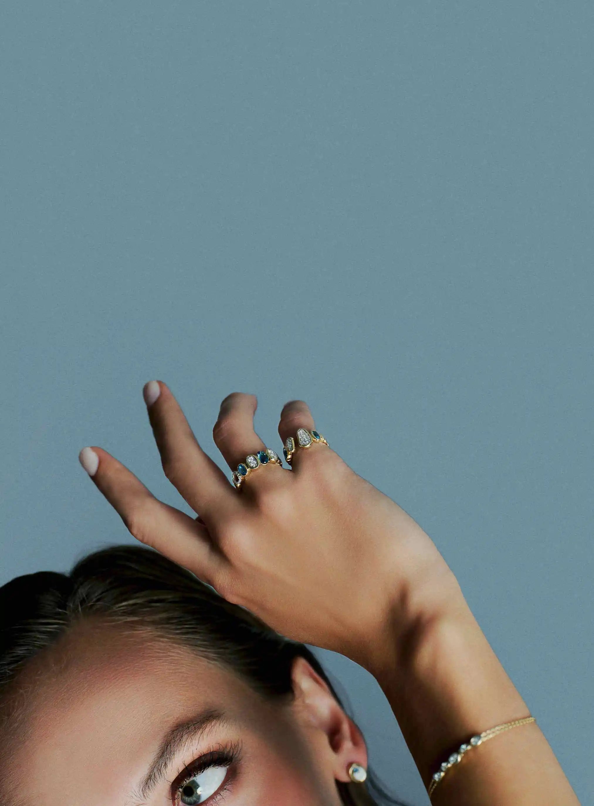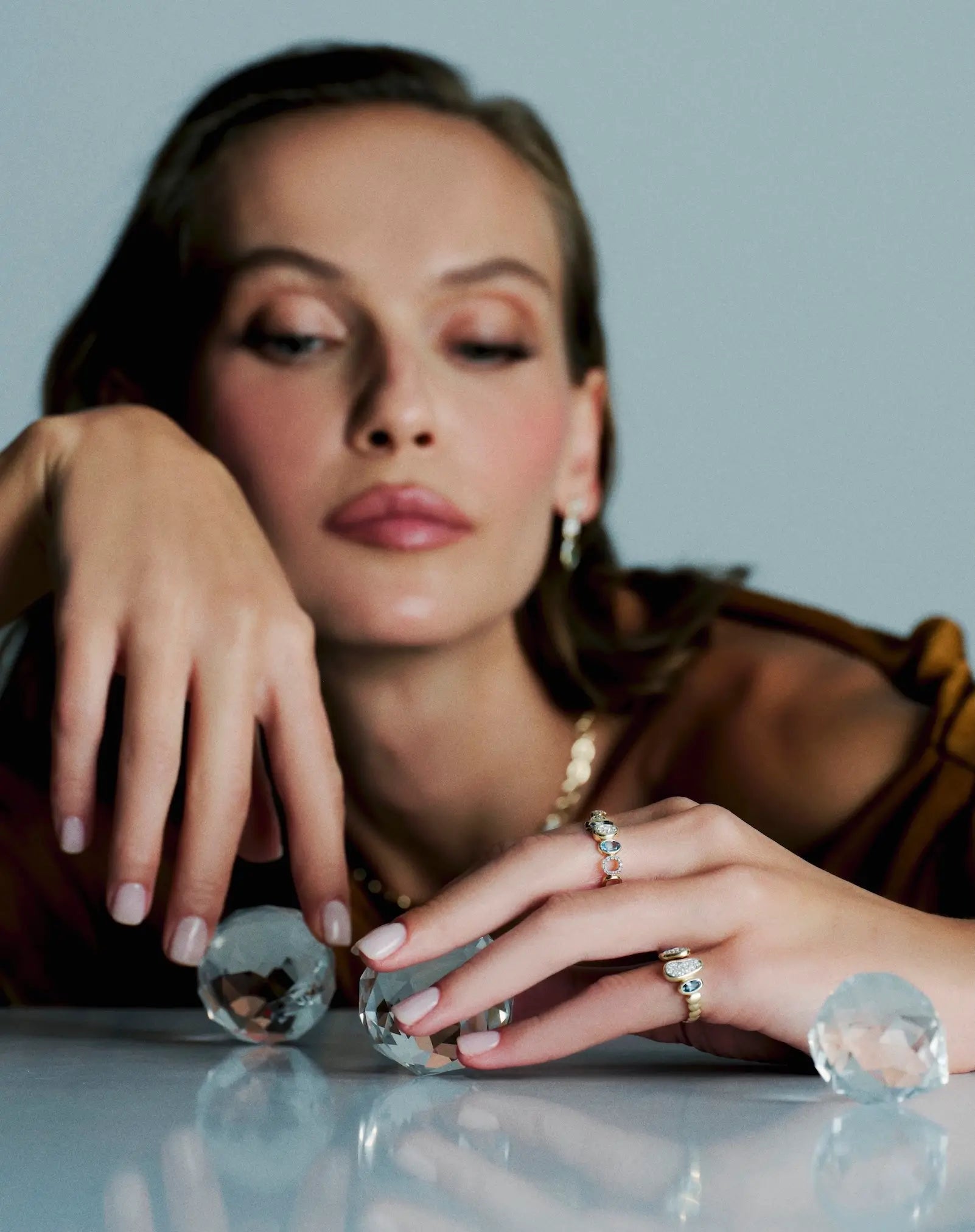 Some oval pieces shimmer with full pavé settings, others remain more minimal — creating a balanced composition that breathes. The harmony of topaz’s tranquil energy and diamond’s sparkle makes this ring a versatile statement, equally radiant from day to night.