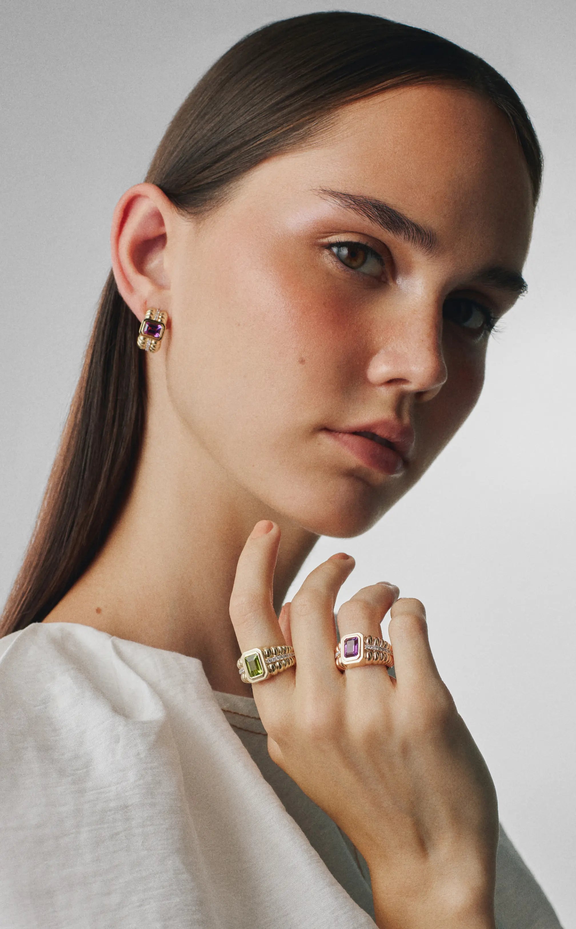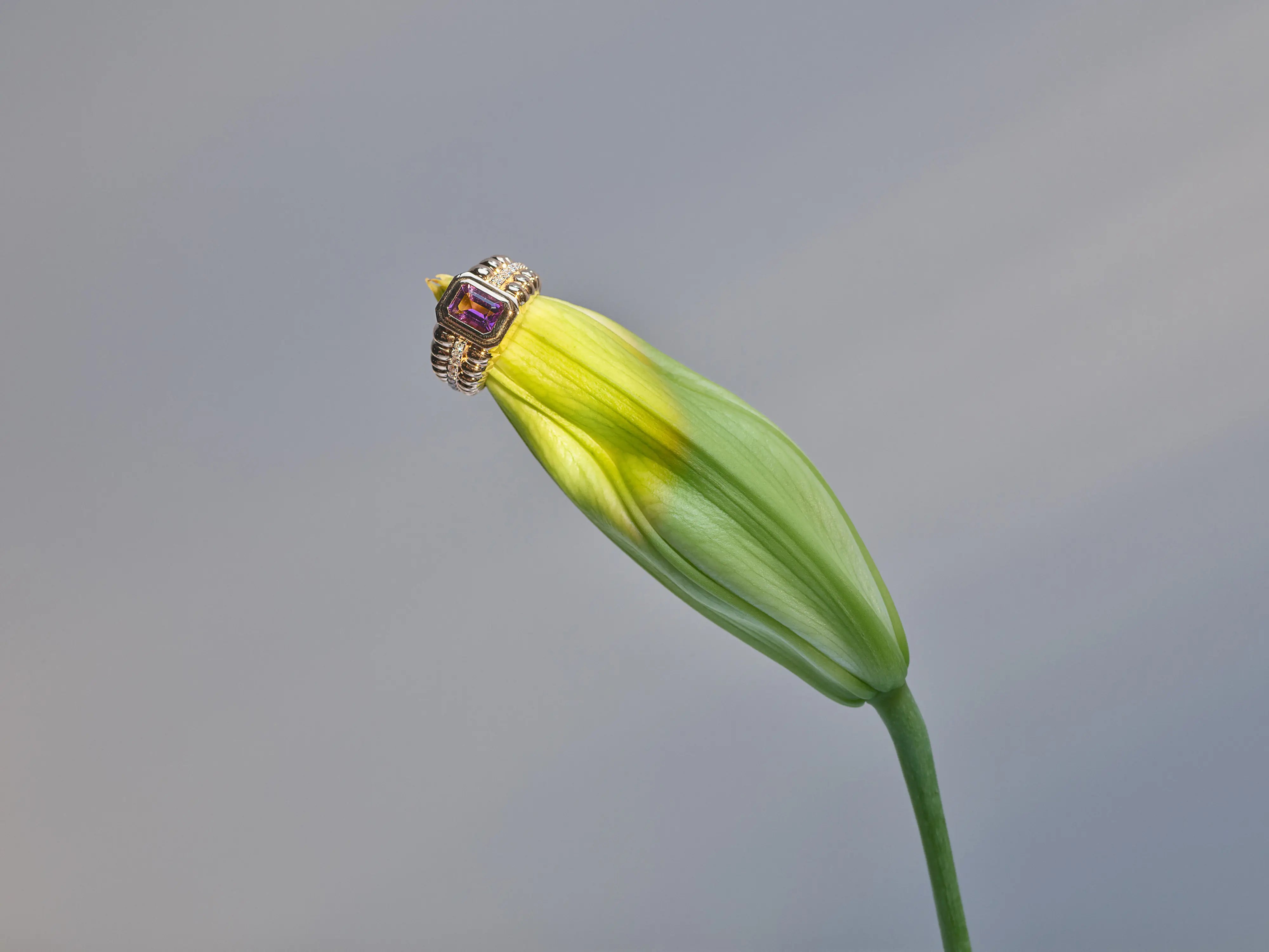 A striking piece from the Morphose02 Collection, this ring combines the elegance and power of transformation with the deep purple hues of amethyst. Amethyst is known as a stone that helps maintain spiritual balance and achieve mental clarity. Increasing inner peace and tranquility, amethyst is a powerful guide in personal transformation. Elegantly set on either side of the ring, the diamonds shimmer in harmony with the warm tones of the gold, adding a sophisticated touch.