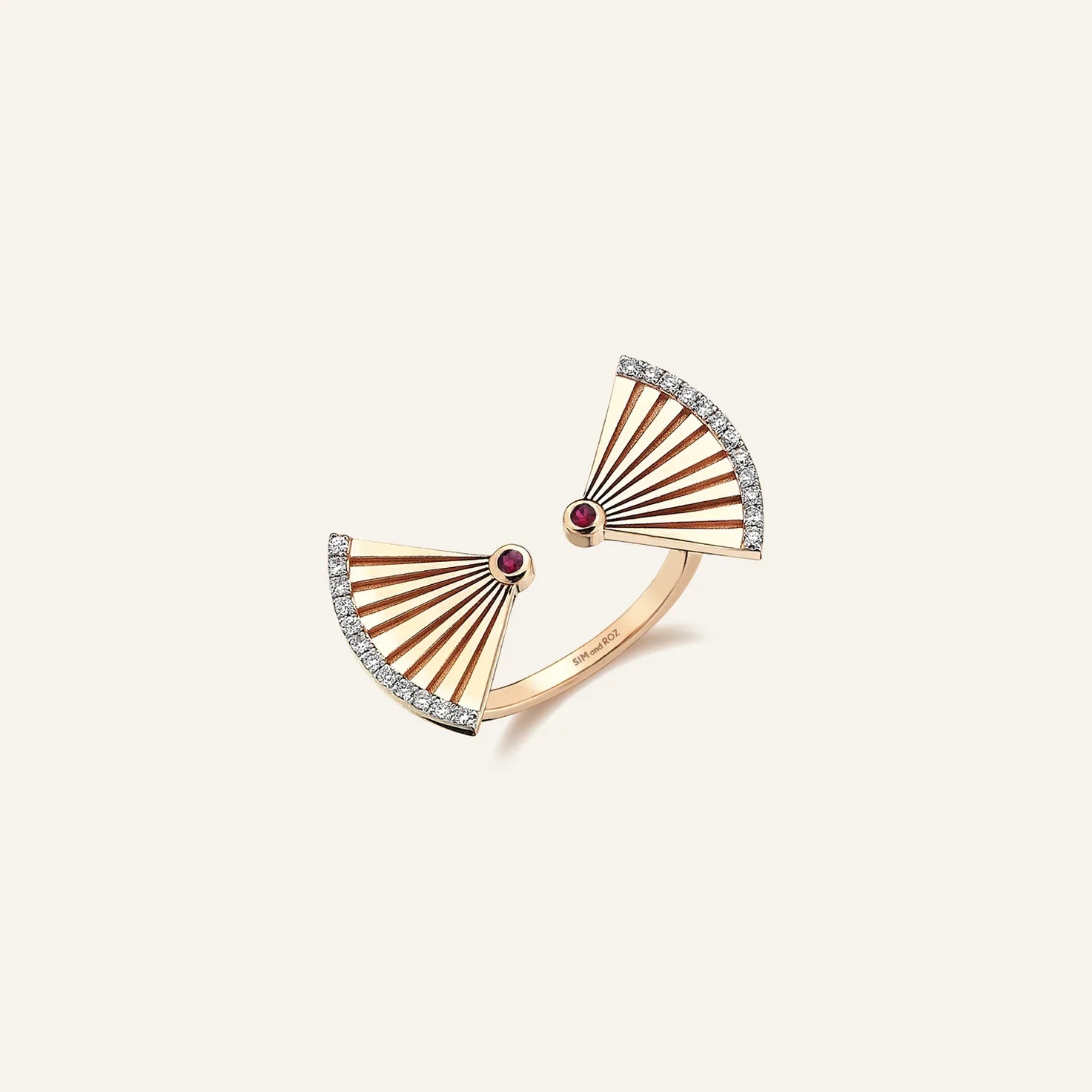 Ray Ruby & Diamond Ring was inspired by the energy of the sun. Ruby stones at the center of the design add a touch of color to the ring, symbolizing the sun's power. The fine lines on either side are reminiscent of sun rays, creating an elegant and modern look.