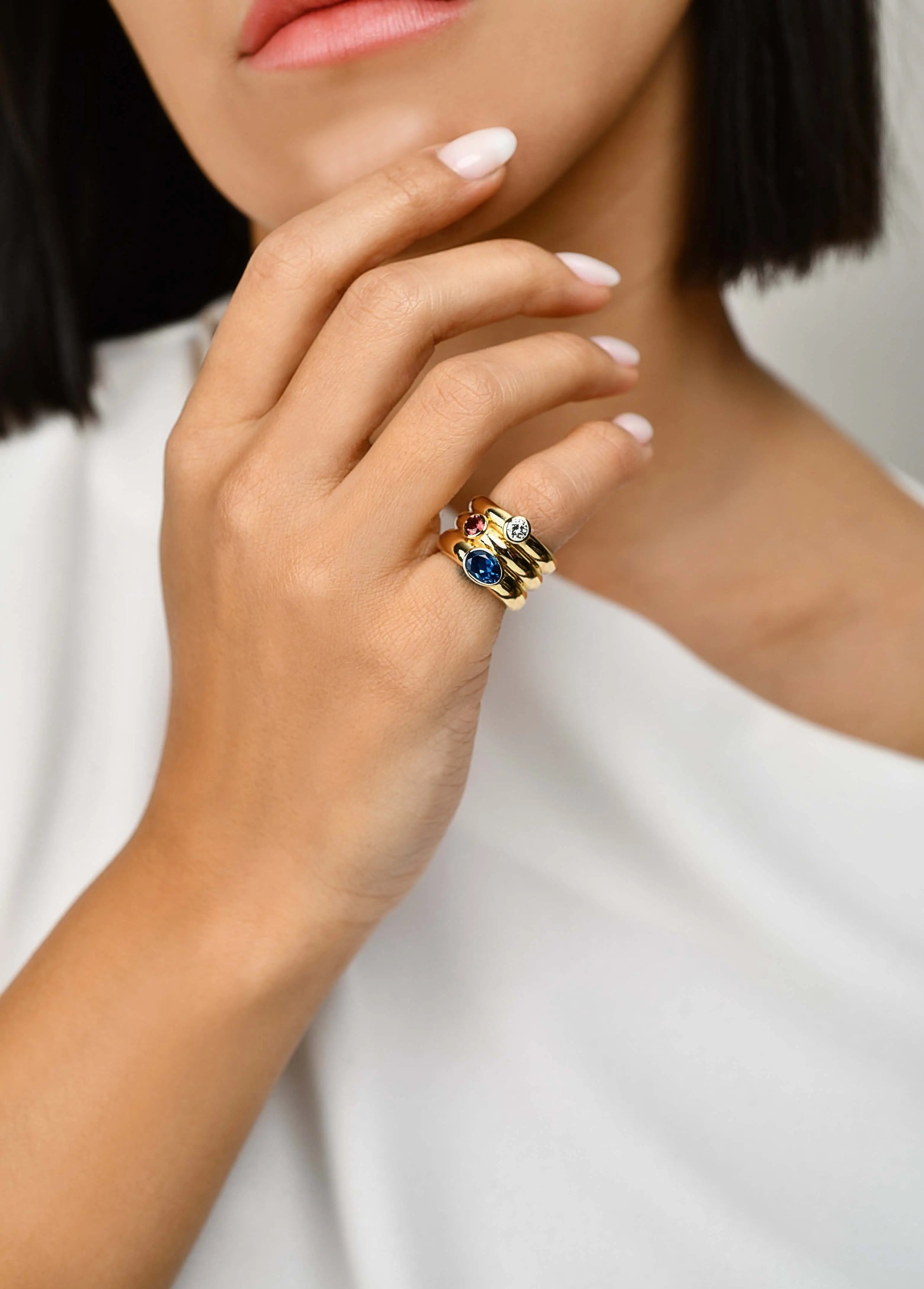 Let Treasured Topaz & Diamond Ring accompany you as you explore life's surprising paths. This ring is adorned with semi-precious stones and diamonds, each telling a unique story. The knotted gold bands, combined with an elegant and modern design, sparkle on your finger. With the captivating sparkle of diamonds, rhodolite, and topaz, this ring is perfect for both everyday wear and special occasions.