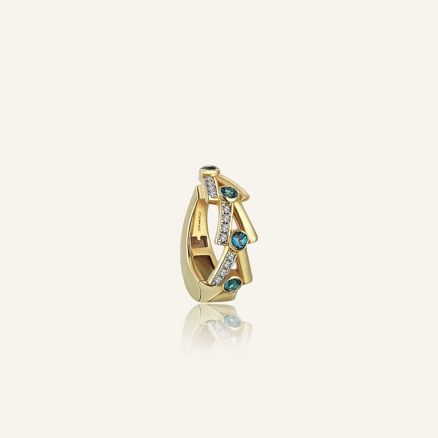 The serene tones of blue topaz meet the sparkle of diamonds in the Beams Topaz & Diamond Ear Cuff, revealing the many traces that shape life. Set within sculpted gold forms, each stone reflects the rhythm of pauses and new beginnings — a reminder of how fragments come together to create meaning. Known as a symbol of clarity and inner peace, topaz adds a deeply personal note to this design. Designed as a single piece, this ear cuff pairs effortlessly with other earrings, creating a distinctive and expressive look.