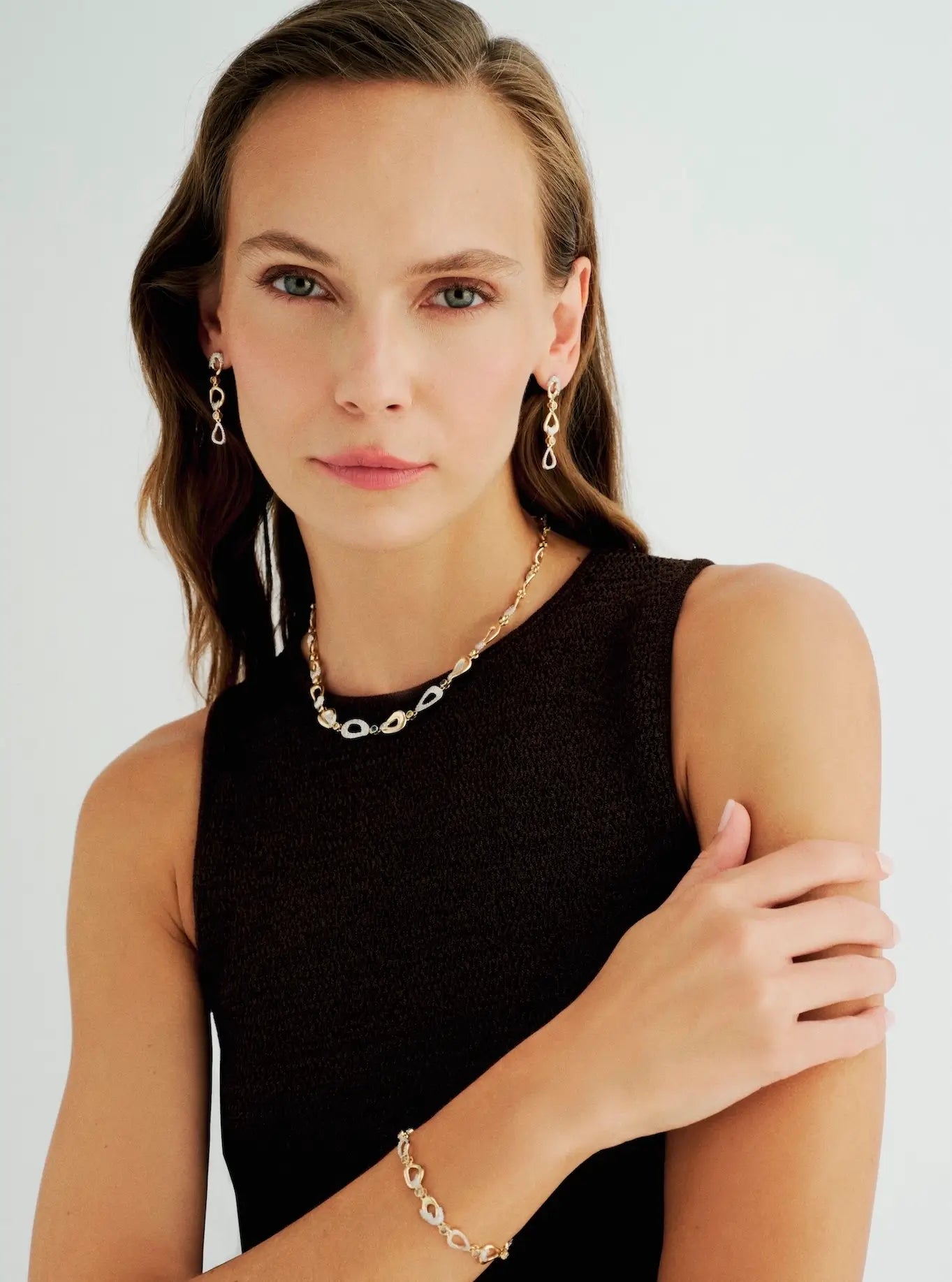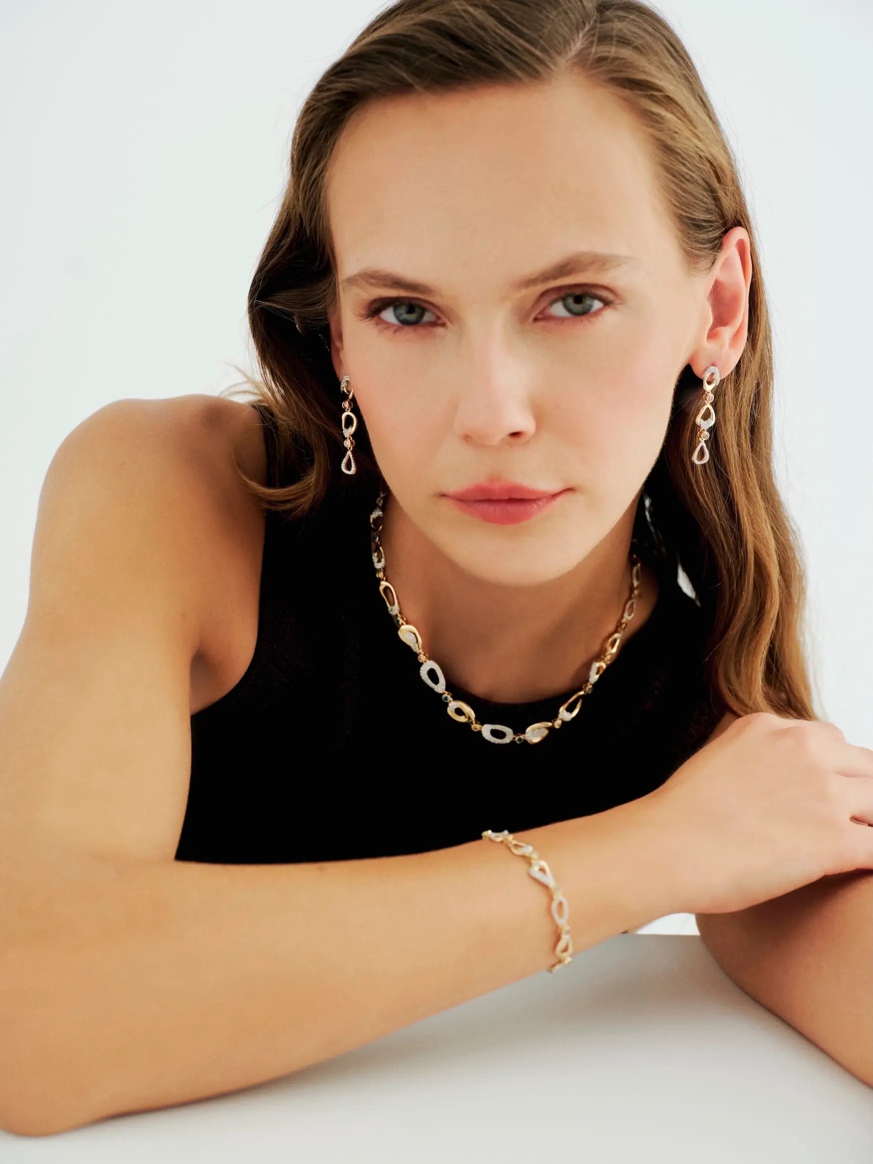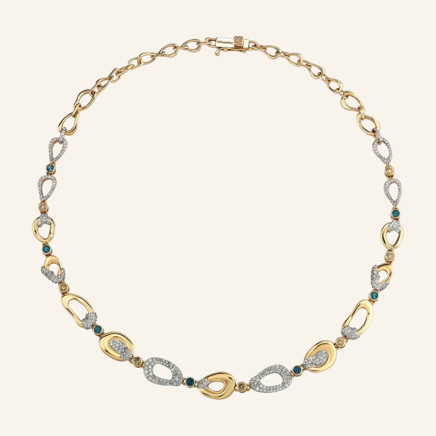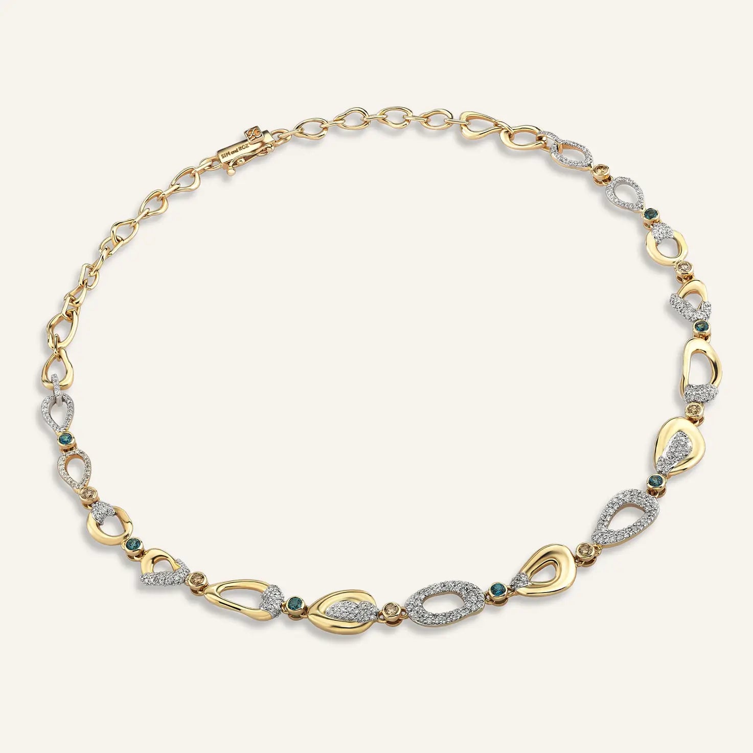 Flow Topaz & Diamond Necklace celebrates the natural rhythm of life through fluid, asymmetrical forms. Each gold curve connects seamlessly to the next, creating a sense of gentle motion and effortless harmony. Scattered throughout, white diamonds, cognac diamonds, and topaz stones coexist in balance — each representing the small yet meaningful miracles that shape our journey.
