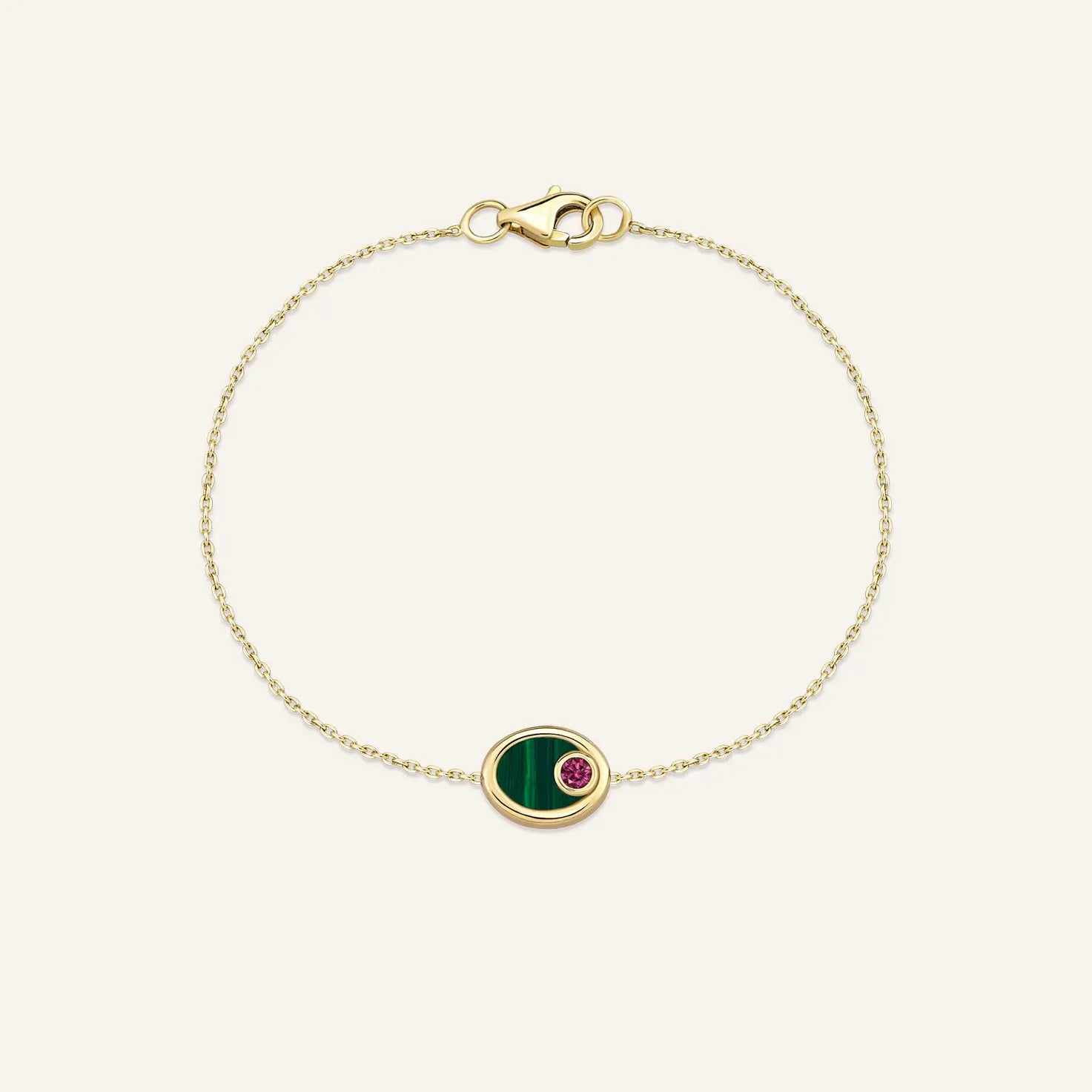 Inspired by the natural cycles of life, this elegant bracelet reflects the harmony of contrasts in a simple way. Green malachite, set in 14-karat gold, symbolizes inner balance and renewal, while the rhodolite detail adds warmth and elegant energy to this balance. The soft lines of the oval shape evoke the essence of the Fragments Collection: the harmony and integrity within imperfections.