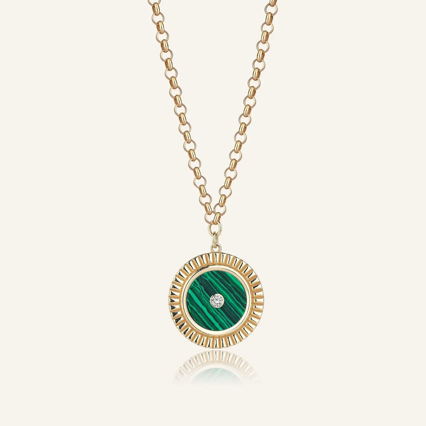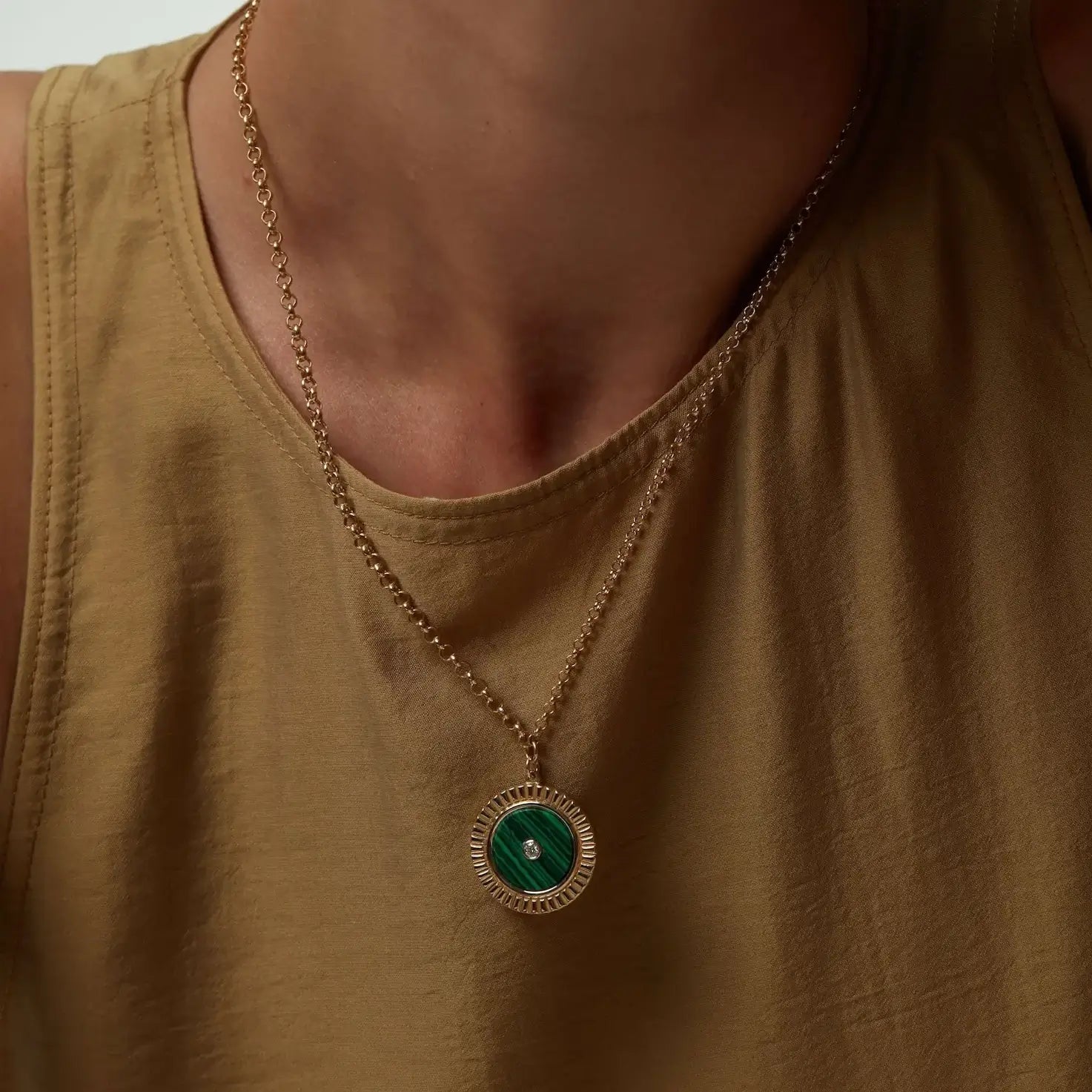 Known for its transformative energy, malachite symbolizes renewal and positive change. Infuse your style with the energy of nature and modern elegance with Dune Malachite & Diamond Medallion Necklace.