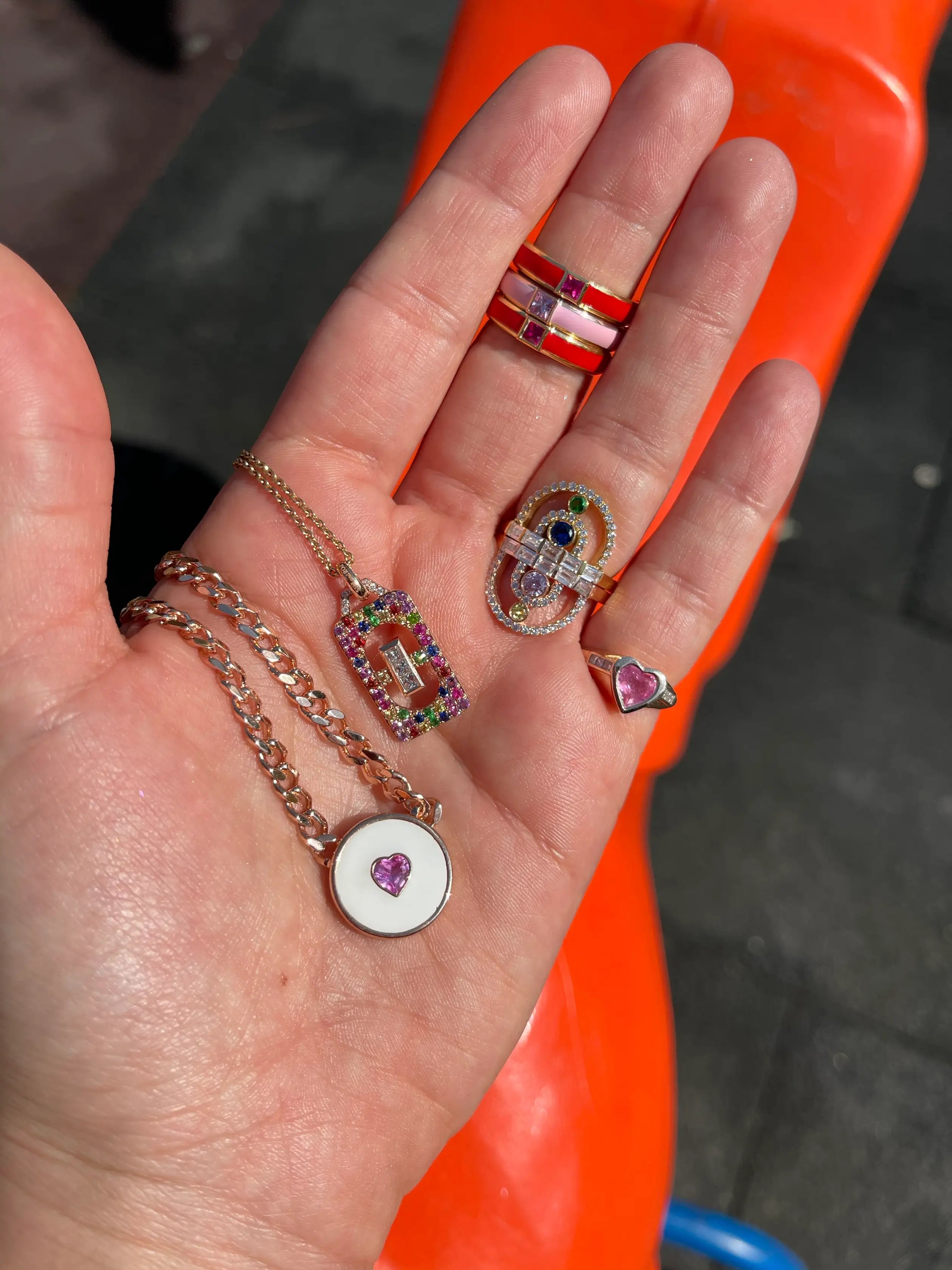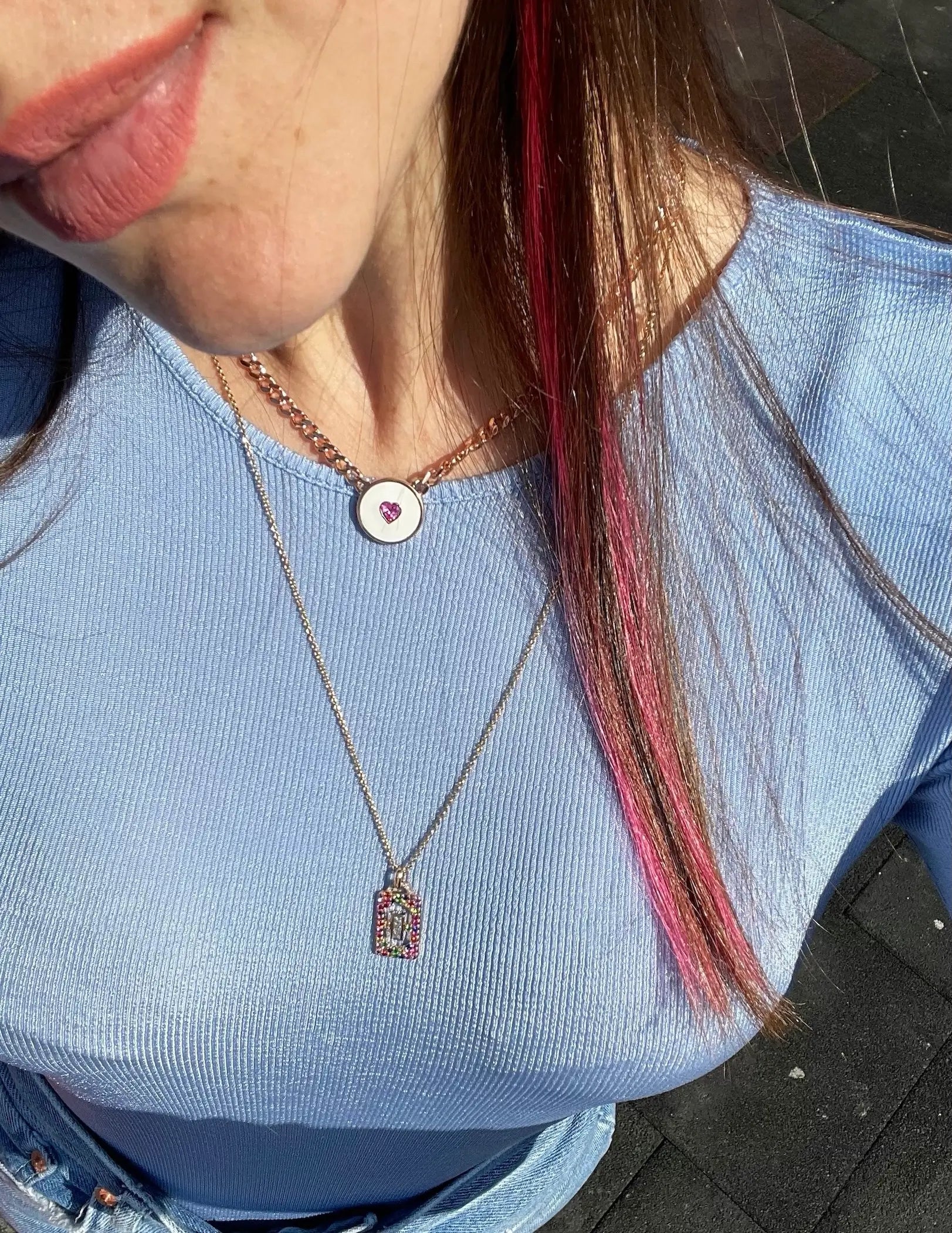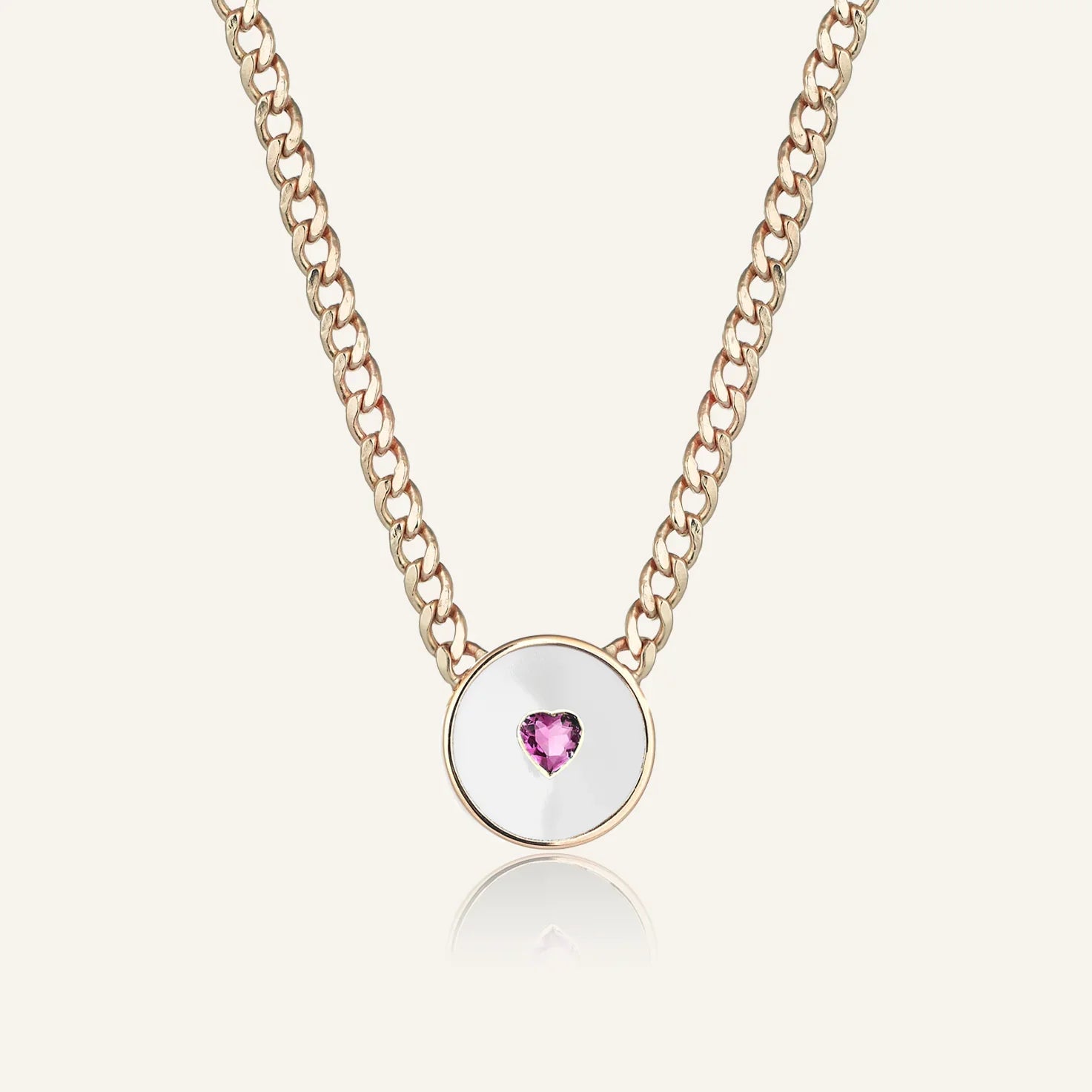 With its refined and modern design, Link White Enamel Sapphire Necklace brings a touch of sophistication. The heart-shaped pink sapphire stands out with its radiant hue, while the white enamel adds a striking contrast. Completed with a 14K gold chain, this special design enriches your look with timeless elegance and a unique accent.