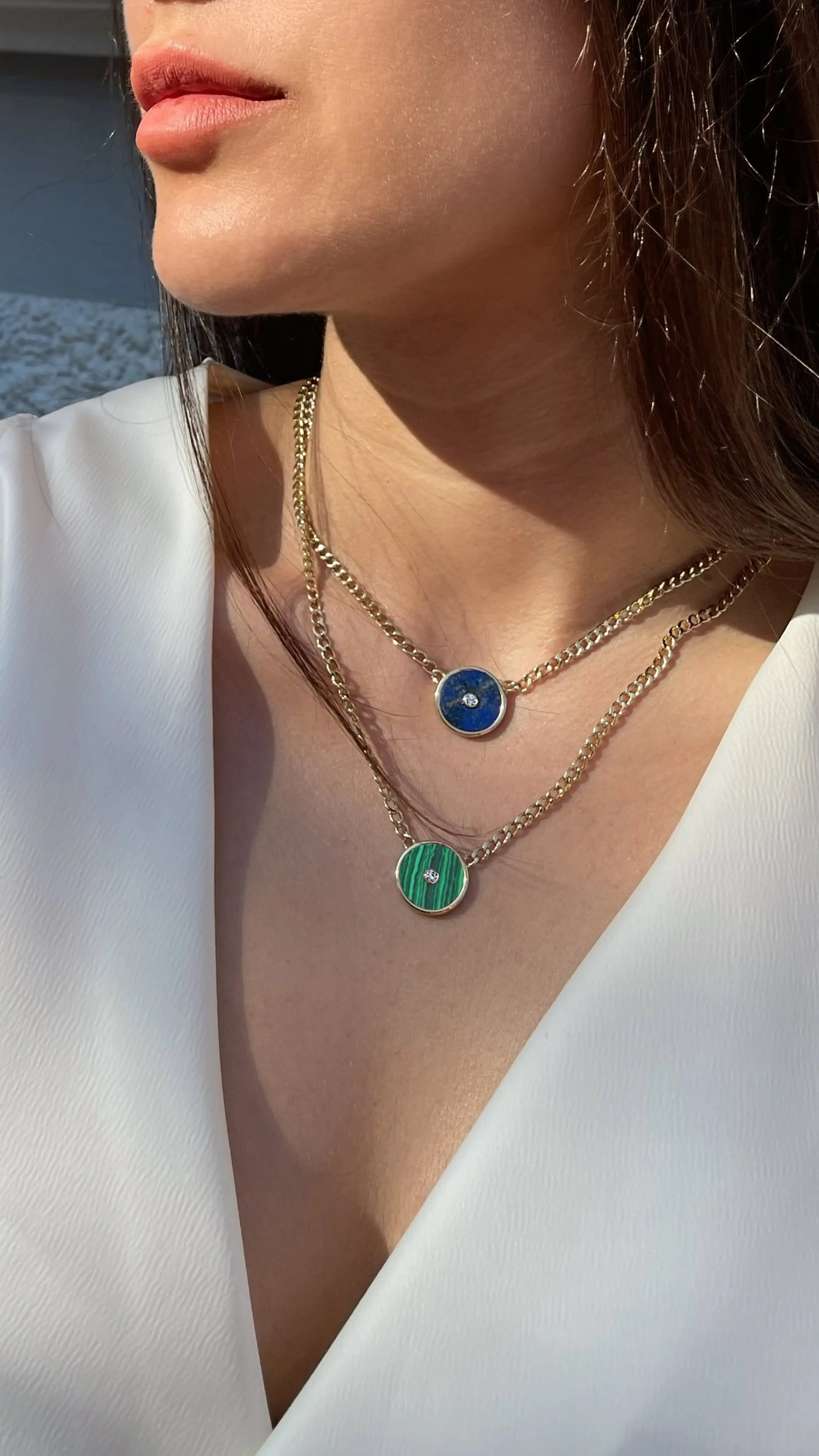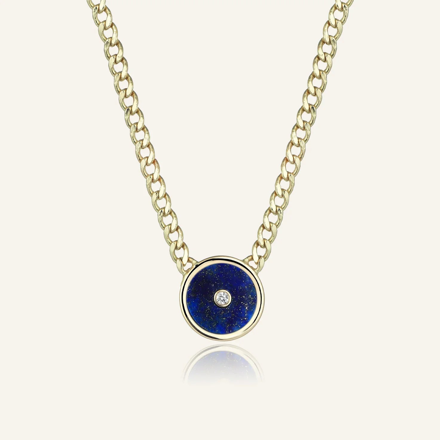 Reflecting the deep mysteries of the universe and the interconnectedness of life, Link Lapis Lazuli & Diamond Necklace offers a dazzling elegance featuring lapis lazuli, a striking natural stone. The modern design of the 14K gold chain adds a sophisticated touch, while the deep blue lapis lazuli, symbolizing infinity, combines with the diamond detail at its center to create an elegant sparkle.